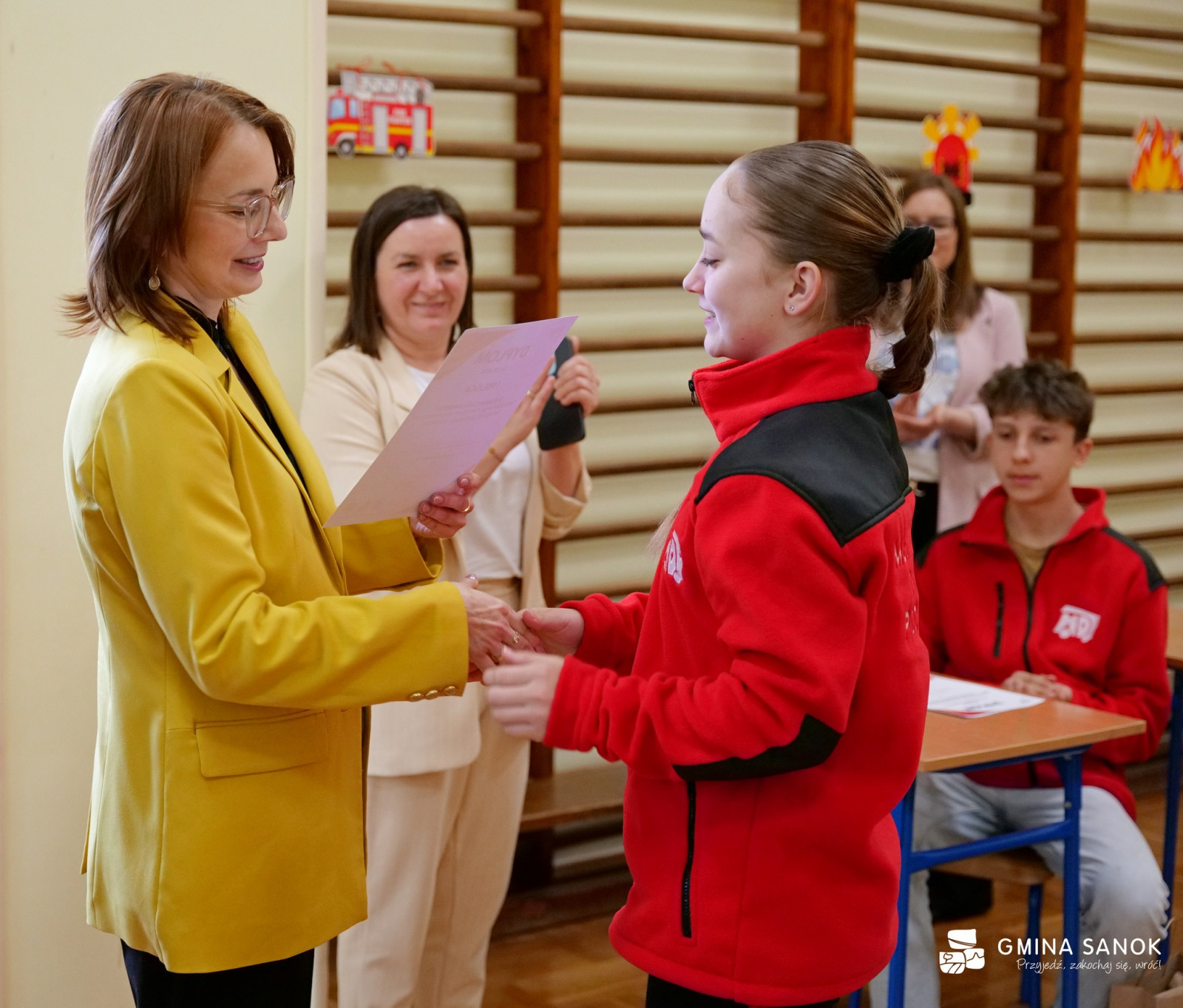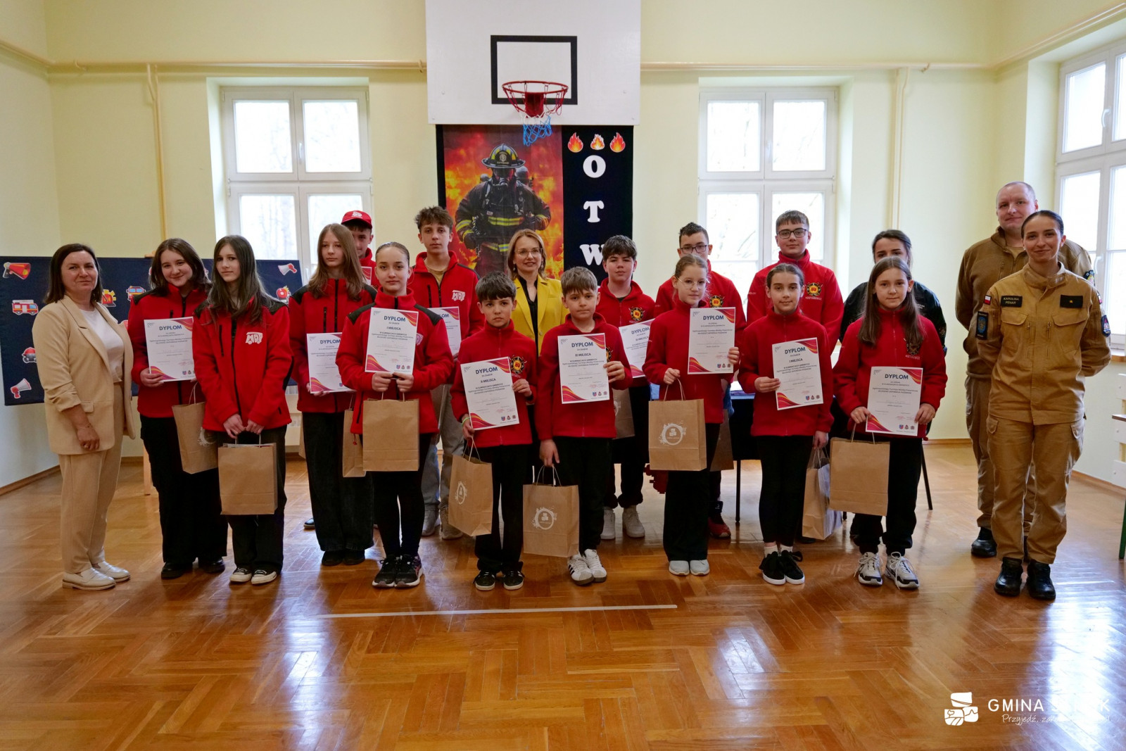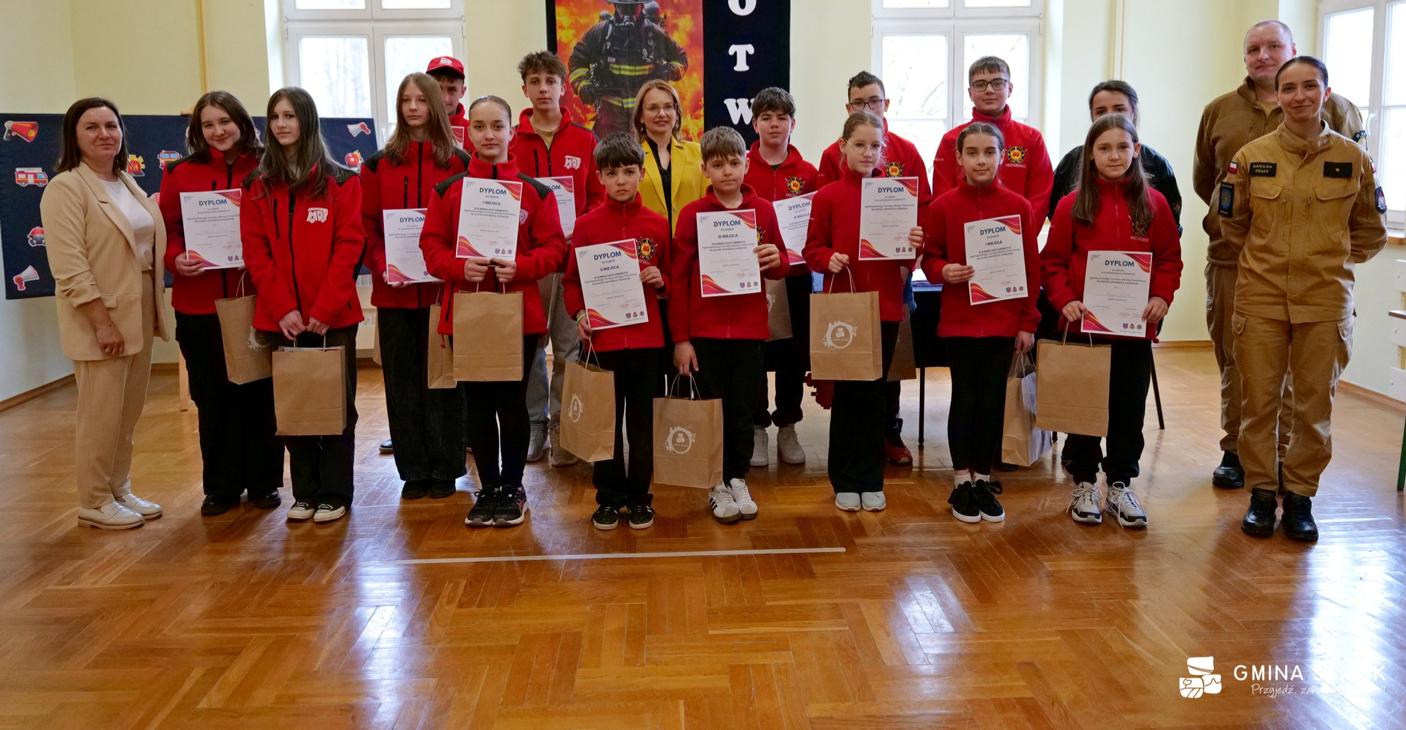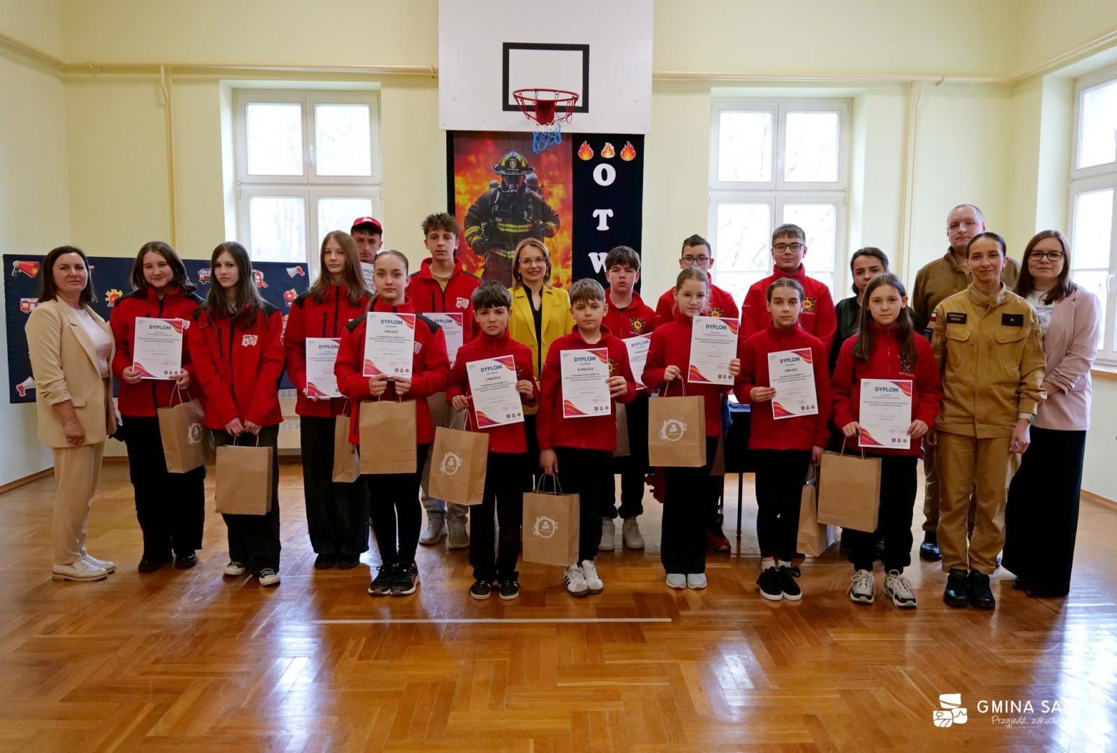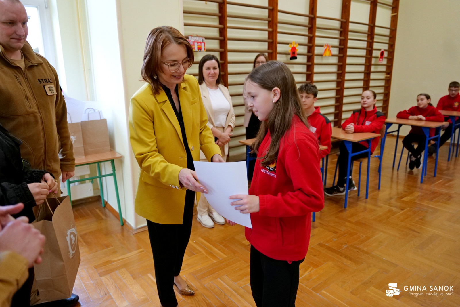Nagrody dla laureatów i uczestników ufundowane przez Gminę Sanok wręczyli: Zastępca Wójta Gminy Sanok Agnieszka Marszałek oraz Prezes Zarządu Oddziału Gminnego ZOSP RP w Sanoku Daniel Bielak.